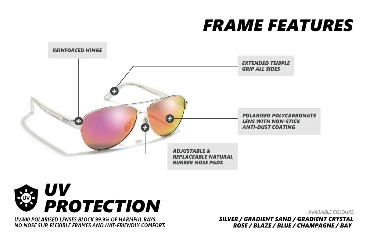 Featuring soft white arms, a golden blush frame and warm rose-gold lenses, it feels like your favourite prosecco in sunglass form —