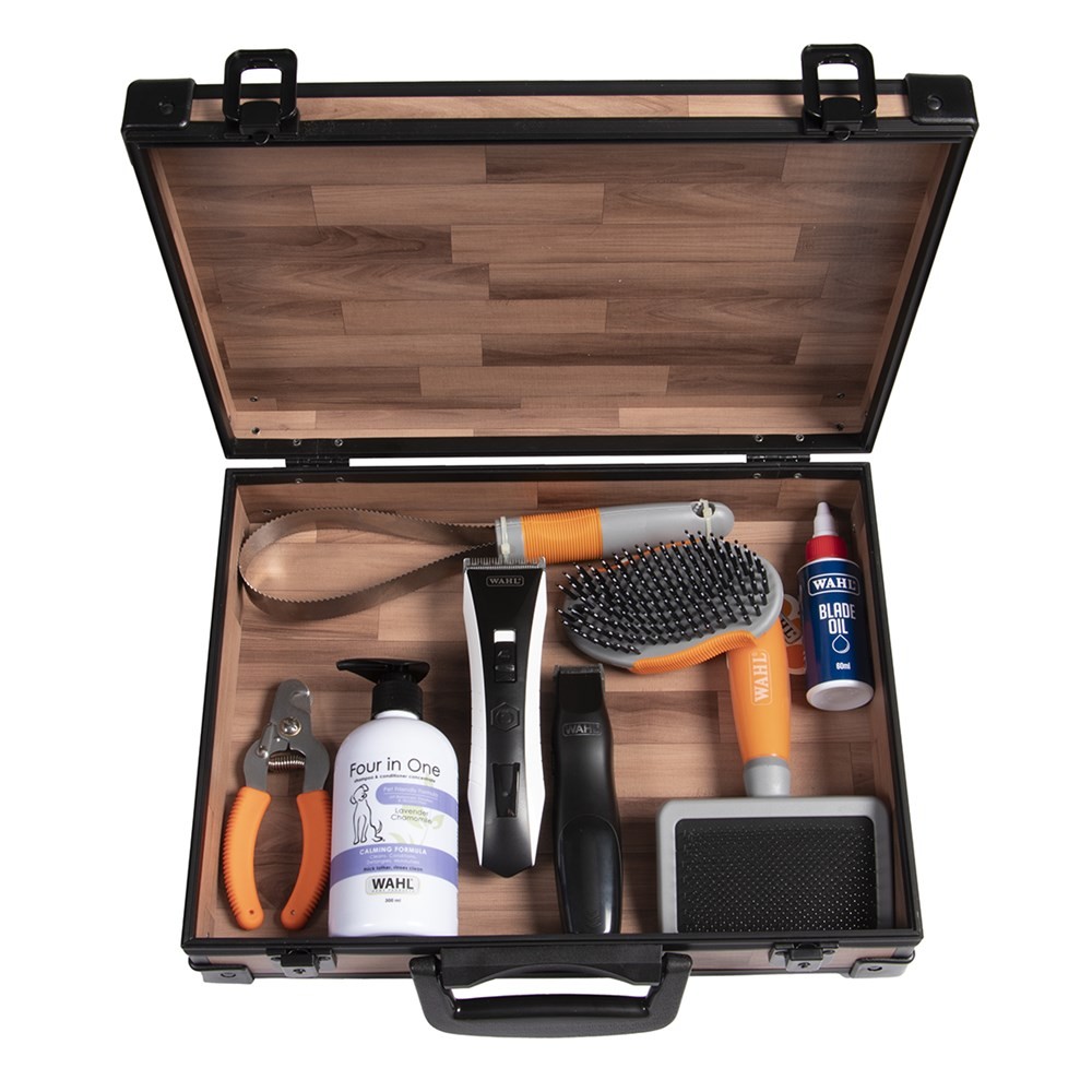 Packaged in an attractive case, the kit includes a bonus cordless trimmer, blade oil, pet nail clippers, slicker brush, palm pal brush, shedding blade, and pet shampoo.