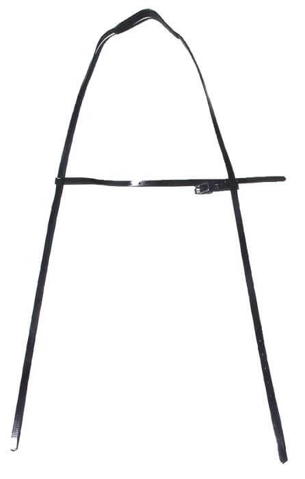 The Front Carry Strap (or Hanger) sits over the horse's wither. It buckles up across the chest, and the ends are attached to the front uptugs of the foreleg hopples.