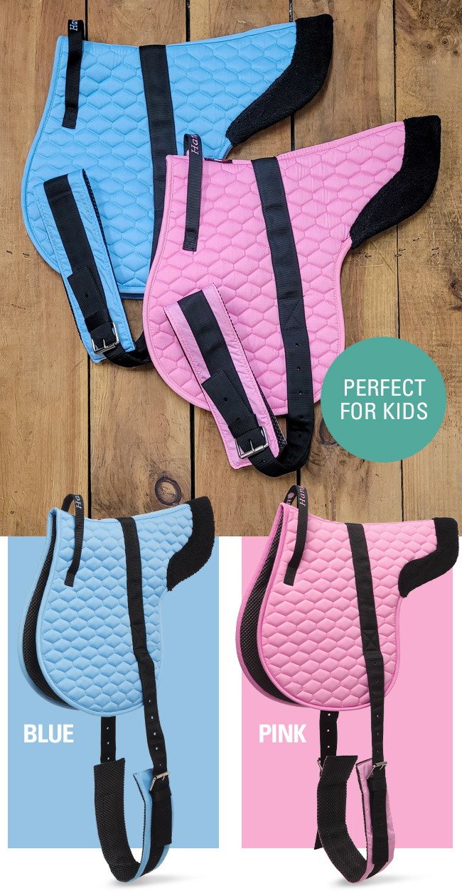 A fun quilted cotton Bare Back Pad, perfect for kids. It features a non-slip PVC lining that ensures the pad will stay in place, and a monkey grip with cute "Hang On!" embroidery.