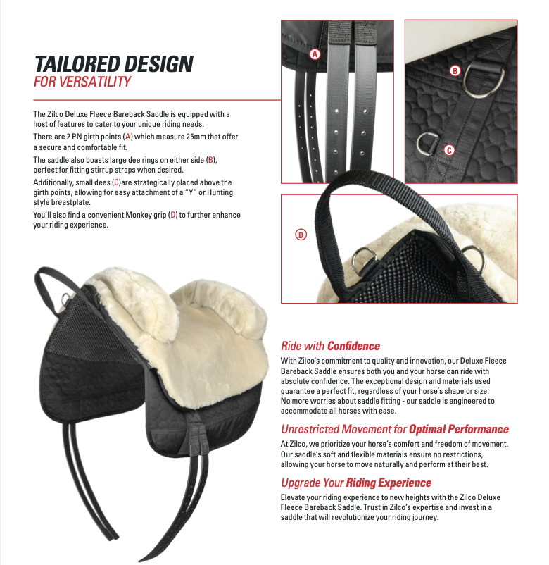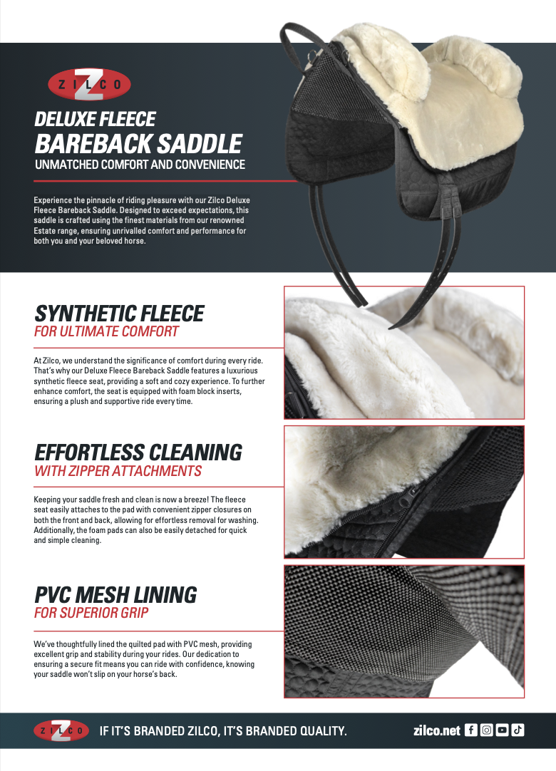 Experience the pinnacle of riding pleasure with our Zilco Deluxe Fleece Bareback Saddle. Designed to exceed expectations, this saddle is crafted using the finest materials from our renowned Estate range, ensuring unrivalled comfort and performance for both you and your beloved horse.