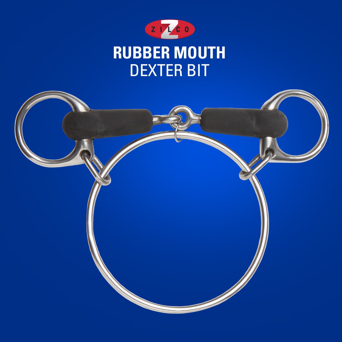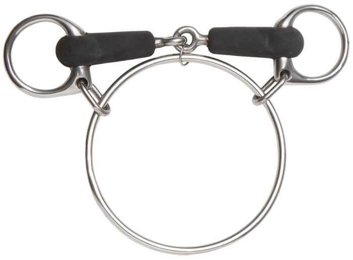 Stainless steel with single jointed mouth. The rubber covering on the mouthpiece is designed for horses with more sensitive mouths. Used mainly in flat racing for horses that lug. The large ring encircles the lower jaw to give the rider more control. This improved model includes a centre ring for a more direct action.