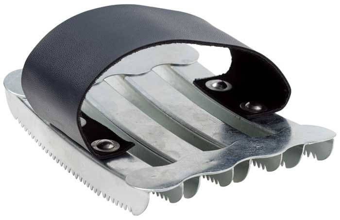 Metal curry with leather hand strap for cleaning dust and hair from brushes.